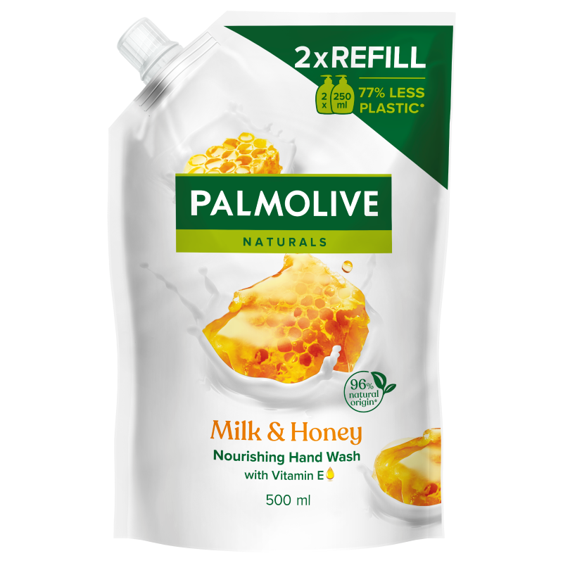 Palmolive Milk & Honeys refillförpackning innehåller 77% mindre plast än ordinare pumpar, vilket gör den till ett miljövänligt val.