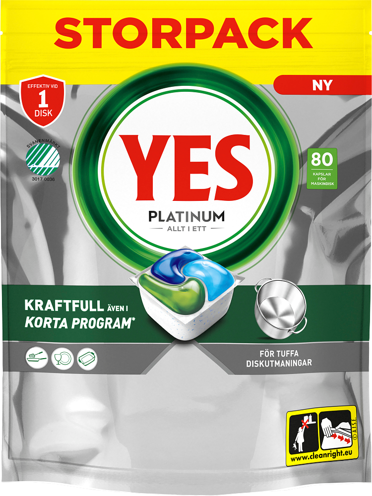 Yes Platinum All in One diskmaskinstabletter ger effektiv rengöring redan vid första diskningen. De klarar enkelt tuffa smutsutmaningar och tar bort fett, för en skinande ren disk varje gång.